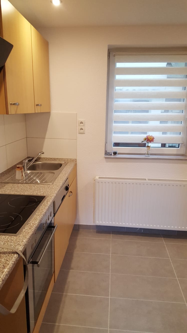 - EG: Flur, Tageslicht-Duschbad mit Fenster und Waschmaschine, Einbauküche (voll eingerichtet mit Kühl-/Gefrierkombination, Herd, Dunstabzug, Spülmaschine, Mikrowelle, Wasserkocher, inkl. Geschirr, Besteck)